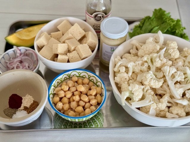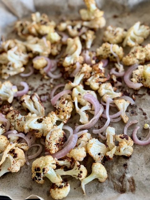 Caulflower florets, chickpeas, tofu and red onion are tossed in a blend of zesty seasonings and roasted to perfection, then served with fresh greens, avocado, and my go-to tahini lemon dressing.