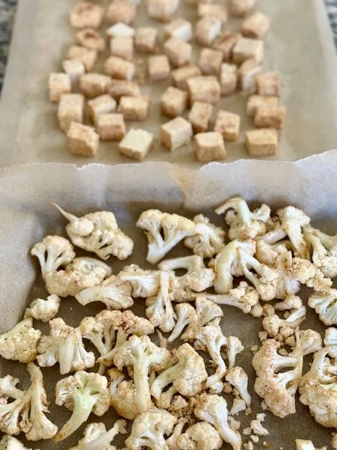 Prep: cut cauliflower into florets discarding big stems, and separately cut tofu into cubes (about 10-12 oz).