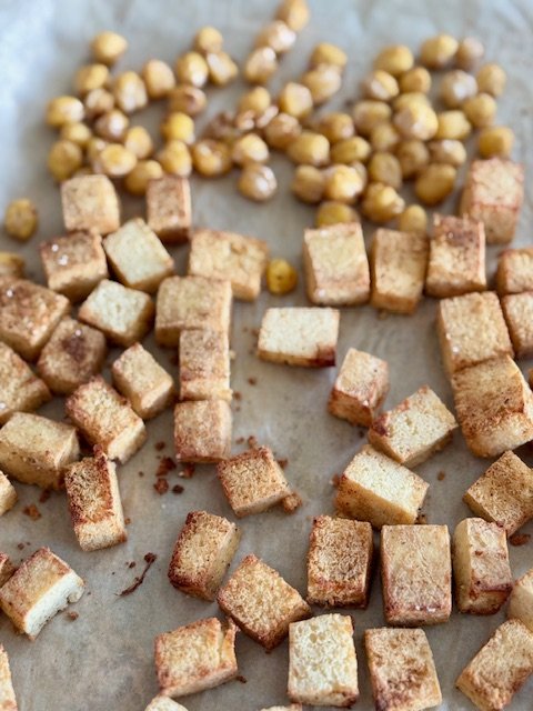 While cauliflower and tofu are in the oven, add the chickpeas to same bowl (that you used to mix cauliflwoer and tofu) and toss with 1 tsp olive oil and the leftover spice mixture.