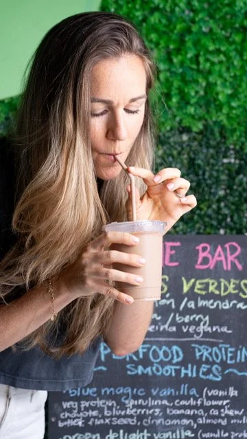 Blend until smooth and creamy. Try it and if you need it sweeter, add another date. If its too thick, add more liquid. If it’s too liquid, add more flaxseeds and more veggies. If it tastes too ‘green”, add a bit more protein powder and/or fruit. Blend again, serve and option to decorate with a drizzle of almond butter and cacao nibs.